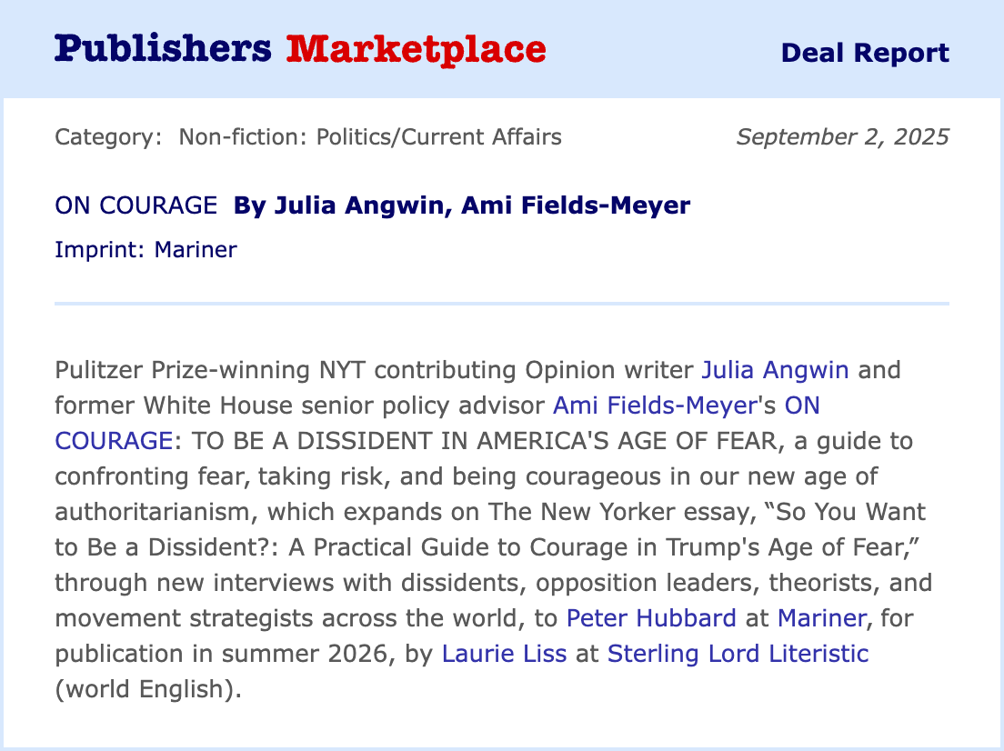 Now Julia and I have signed a contract with the HarperCollins Mariner imprint to expand our reporting into a book. ON COURAGE is a deeply reported guide to taking risk and doing courageous things when the state is using fear as a weapon against its people. The book weaves the stories and lessons of dissidents on five continents into a manual for Americans. It’s scheduled to be published next summer.
